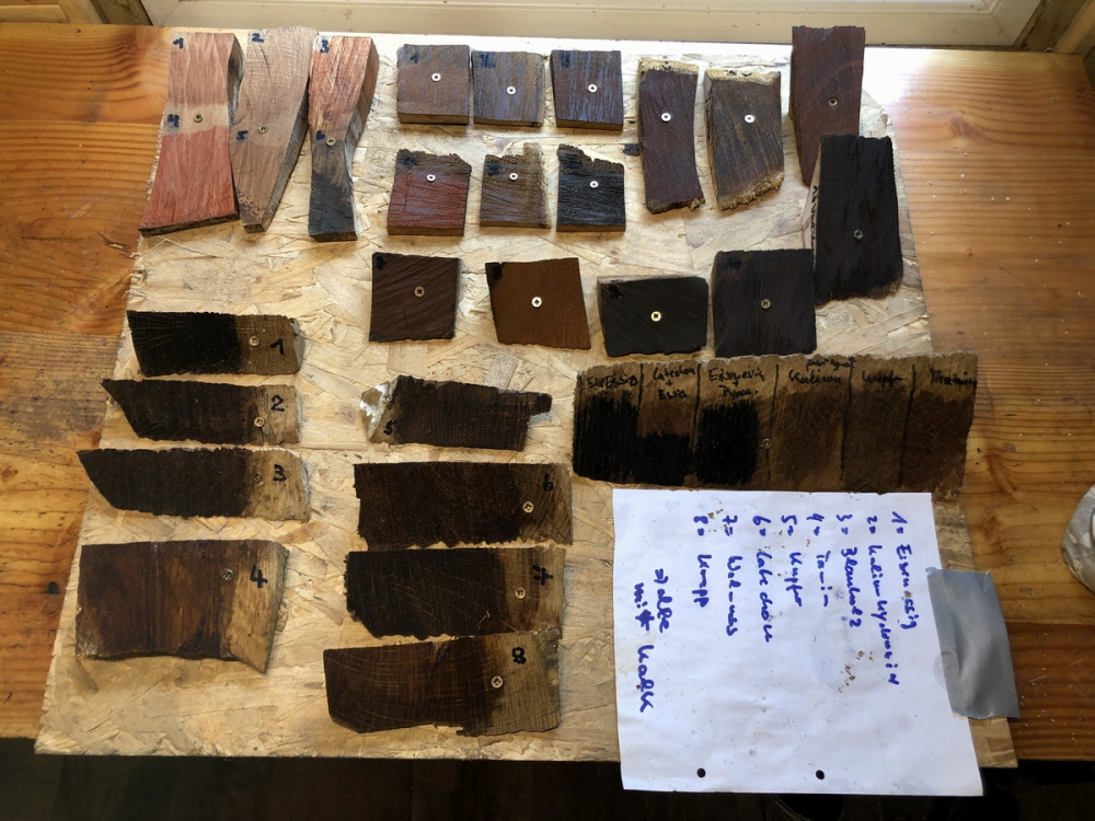 Die Ergebnisse haben mich zum Teil überzeugt. Vor allem die Beizen mit Catechou und Alaun auf Eichenholz.