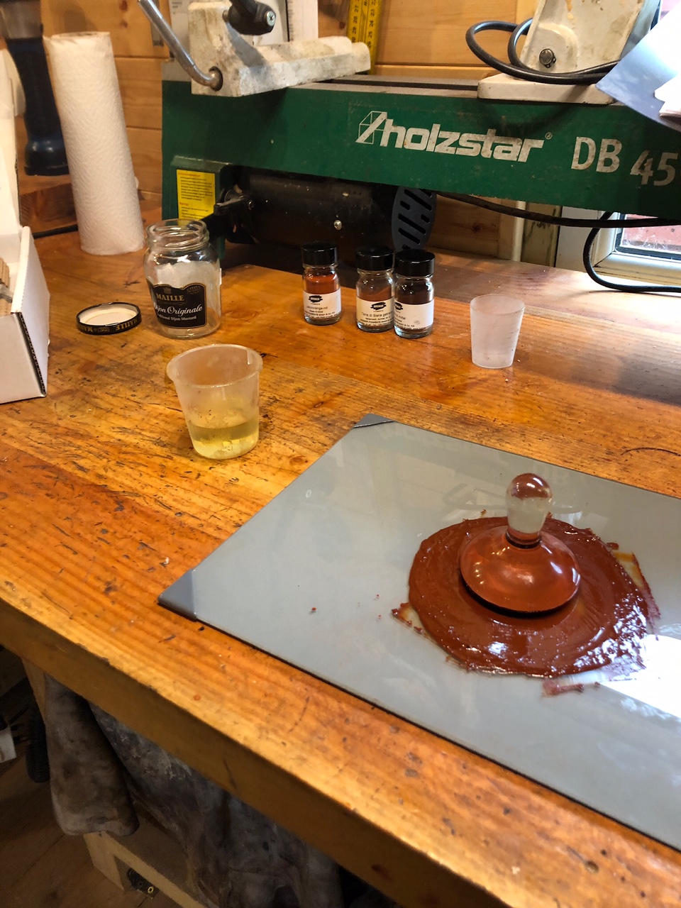 In autumn 2021 and January/February 2022 I tried out more old pigments and techniques. I've tried various historical stains. I took many suggestions from the book "Source texts for coloring wood 1770 - 1930" by Hans Michaelsen.