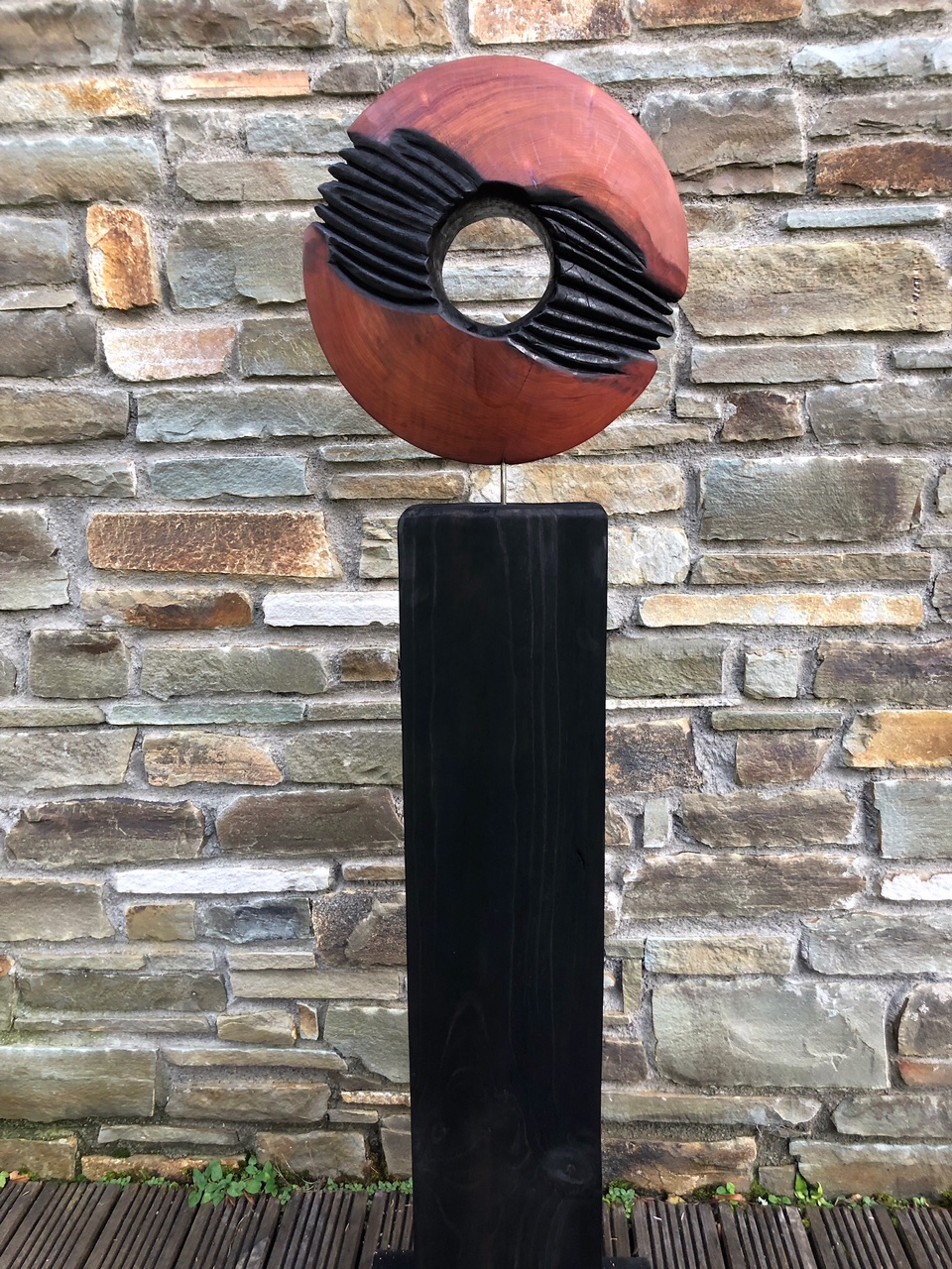 Gedrechselt + Hand gecarved + mit Feuer ebonisiert: Monterey-Zypresse, Mohnöl mit Orangenöl; Schellack: Ø 40 cm. Stele aus Kiefer, geschwärzt mit Eisenessig. Gesamthöhe 165cm