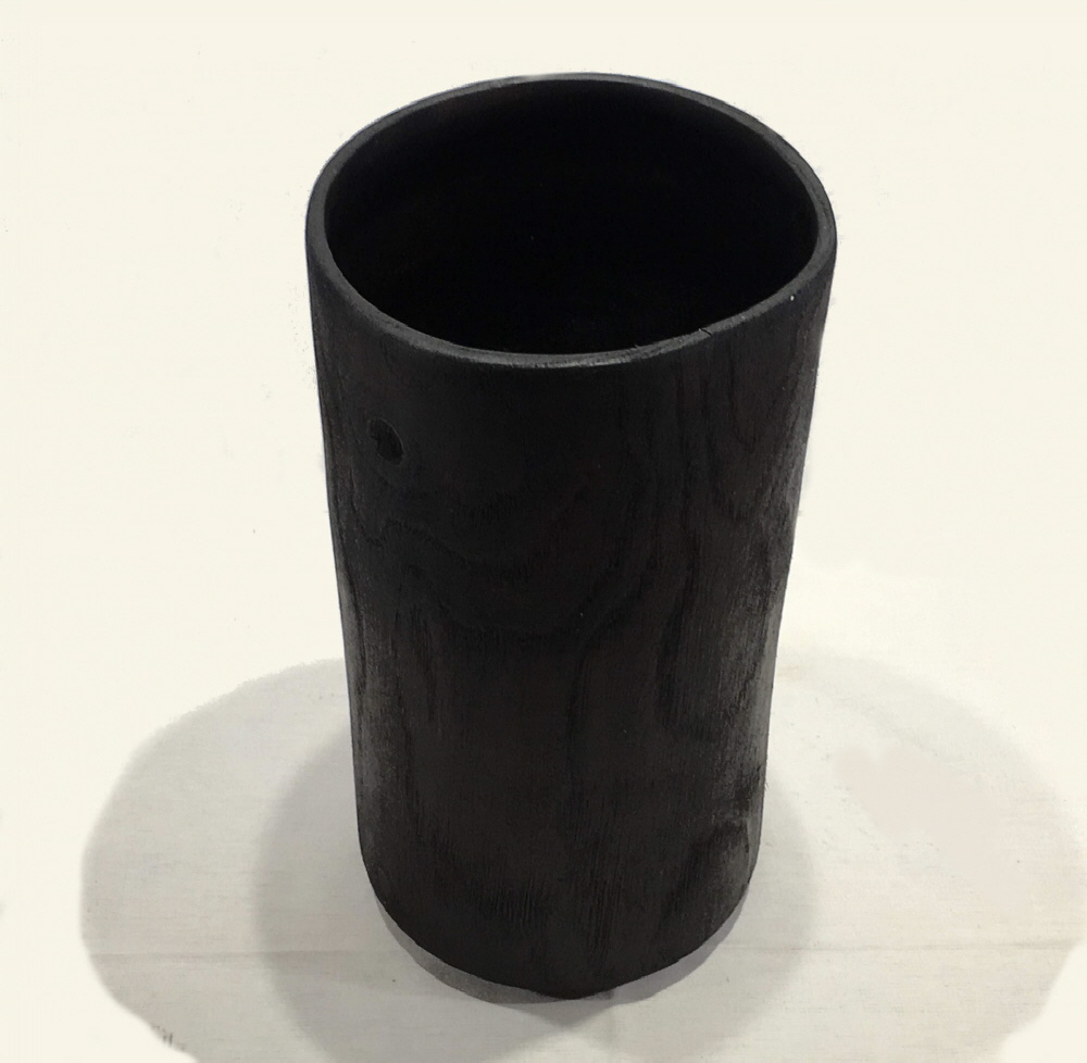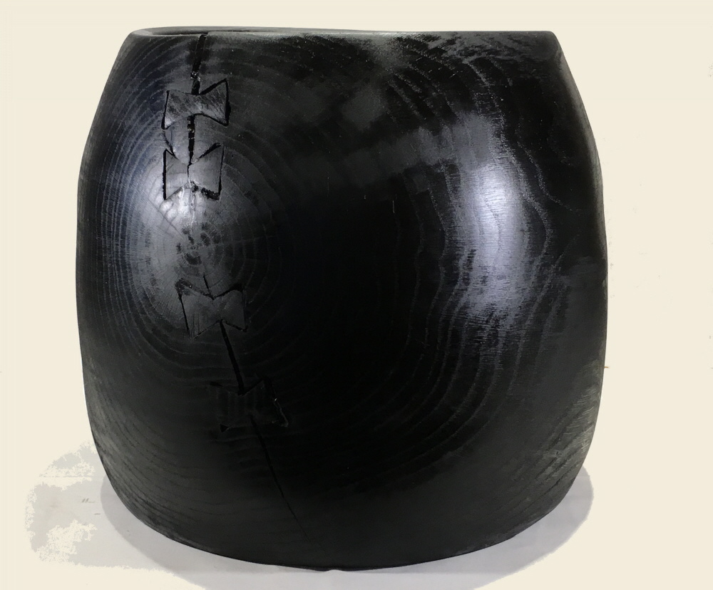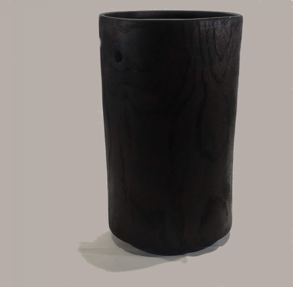 Nass gedrechselt: Weiß – Eiche, gekalkt, geschwärzt, geölt, Riss mit Schwalbenschwanz; Höhe: 25cm, Ø 14cm